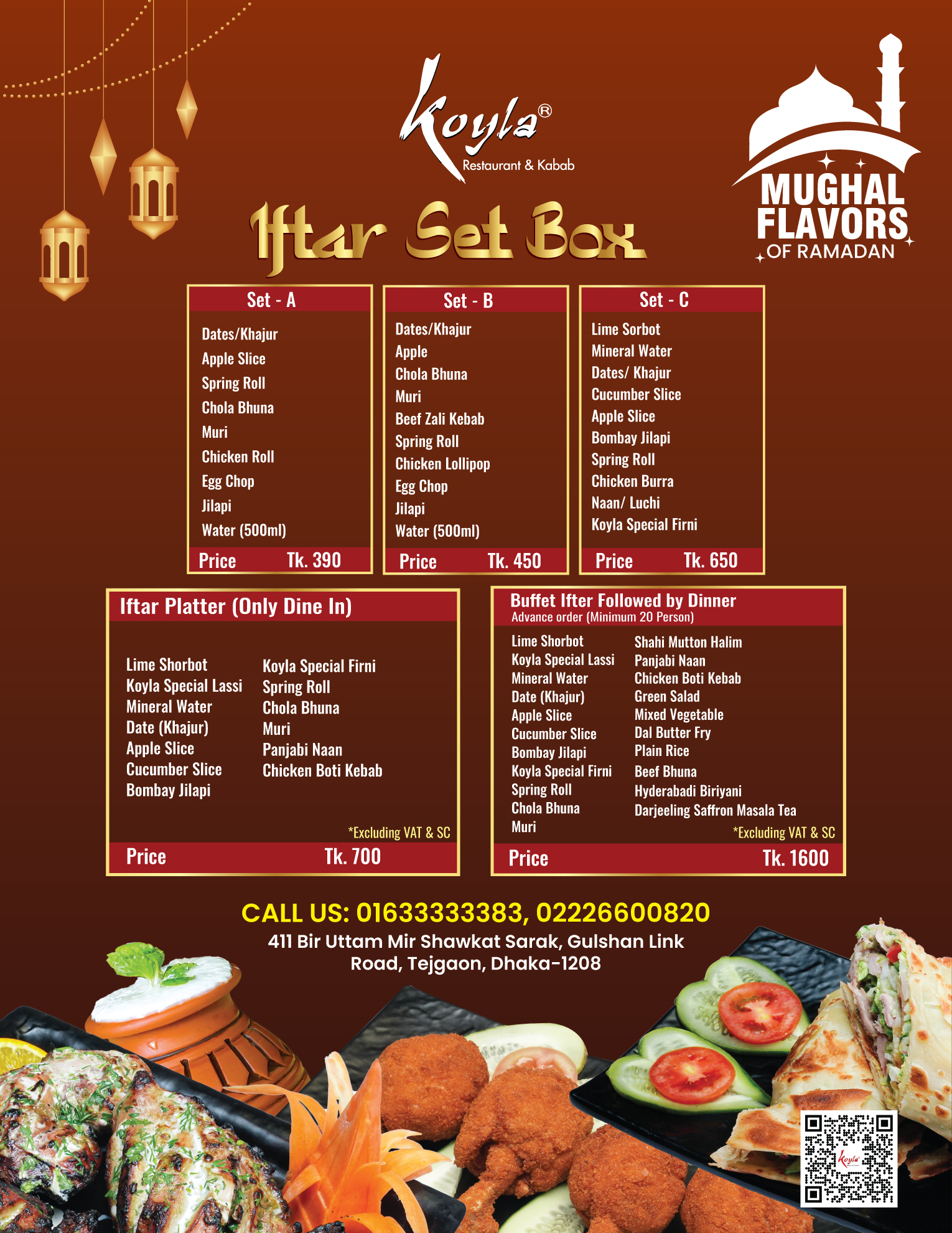 (For 3 persons) Mixed Kababs, Like Chicken Burra, Chicken Malai Tikka, Afgani Chicken, Paneer Tikka, Beef Sheek Kebab, Beef Boti Kebab And Fish Tikka.